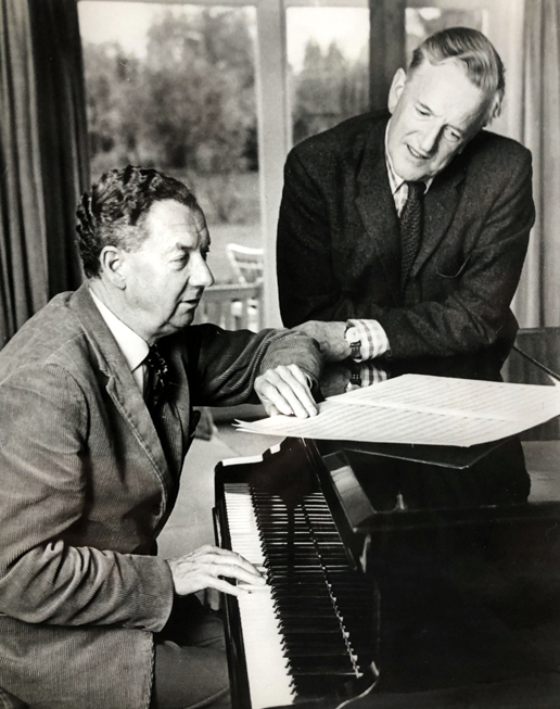 Benjamin Britten (1913-76) at the piano with tenor Peter Pears (1910-86) who lived together at 99 Offord Road 1966-70 and from then until Lord Britten's death in 1976 at 8 Halliford Street, where in 1985 Sir Peter unveiled a plaque to him.