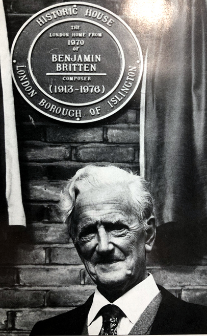 Benjamin Britten plaque at 8 Halliford Street unveiling on 9th October 1985 by tenor Sir Peter Pears (1910-86), who lived with him at 99 Offord Road 1966-70 and from then until Lord Britten's death in 1976 at Halliford Street.