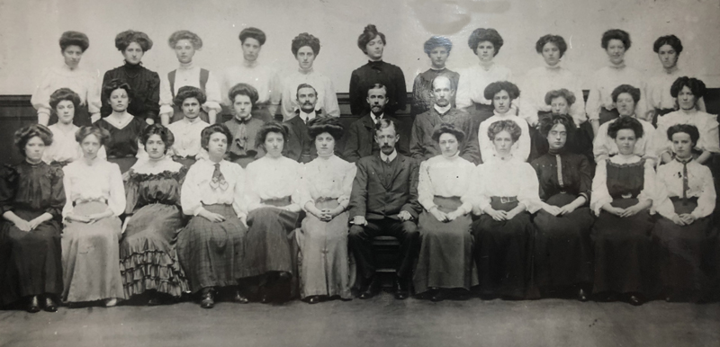 James Duff Brown (1862-1914) librarian and educationalist. Devised classification systems and safeguarded open access 1893. Group photograph with 4 male and 30 female staff of Clerkenwell Library. Lived at 15 Canonbury Park South.